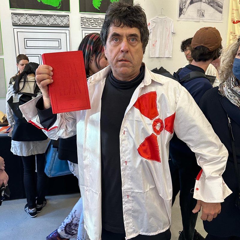 below the dadalenin writer and book maker and shirt maker and rainer ganahl at the bookfair new york with his red nuclear shirt modelling commedesmarxists see commedesmarxists.com