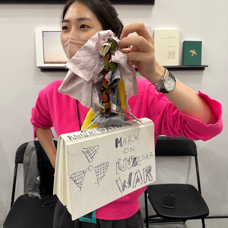 below the dadalenin writer and book maker and shirt maker and rainer ganahl at the bookfair new york with his red nuclear shirt modelling commedesmarxists see commedesmarxists.com